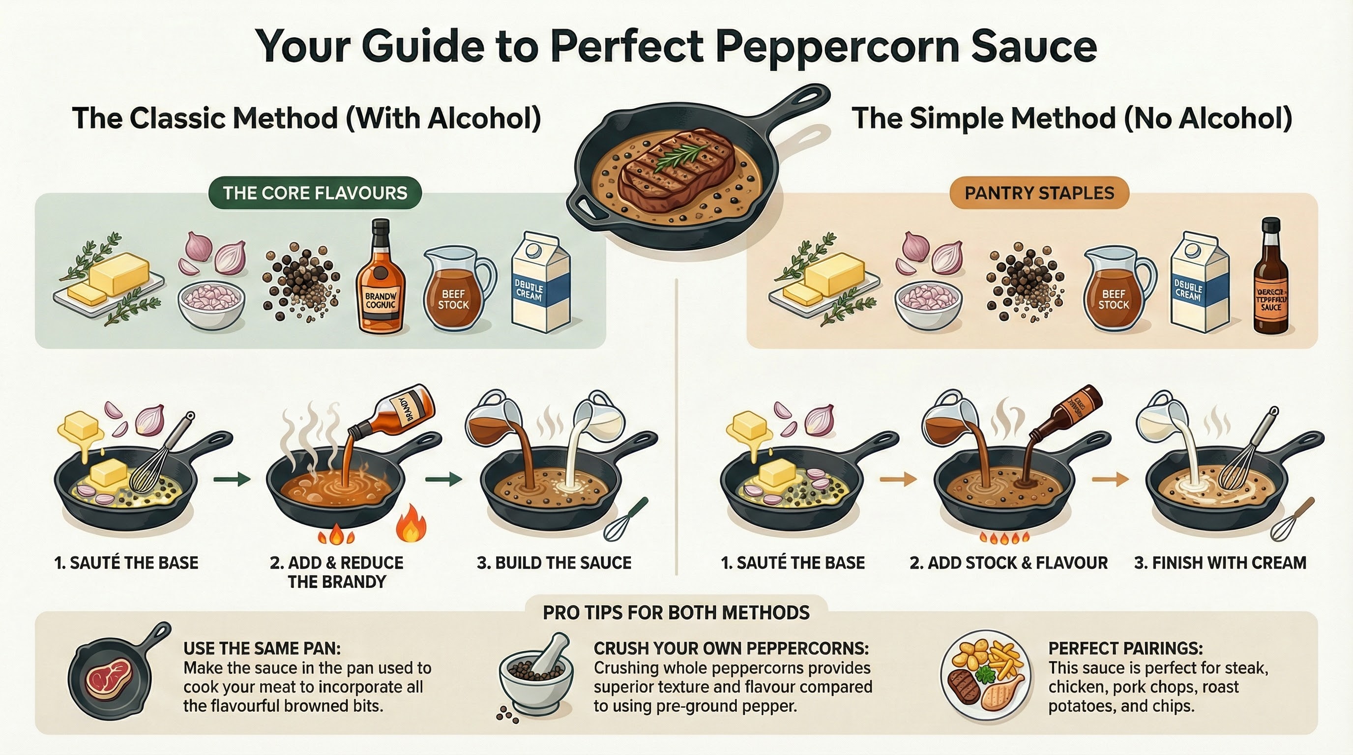 Rich, creamy peppercorn sauce with that slow-burn heat from cracked peppercorns. Uses the Velvet Finish technique for a glossy, restaurant-quality result. Works with or without brandy.