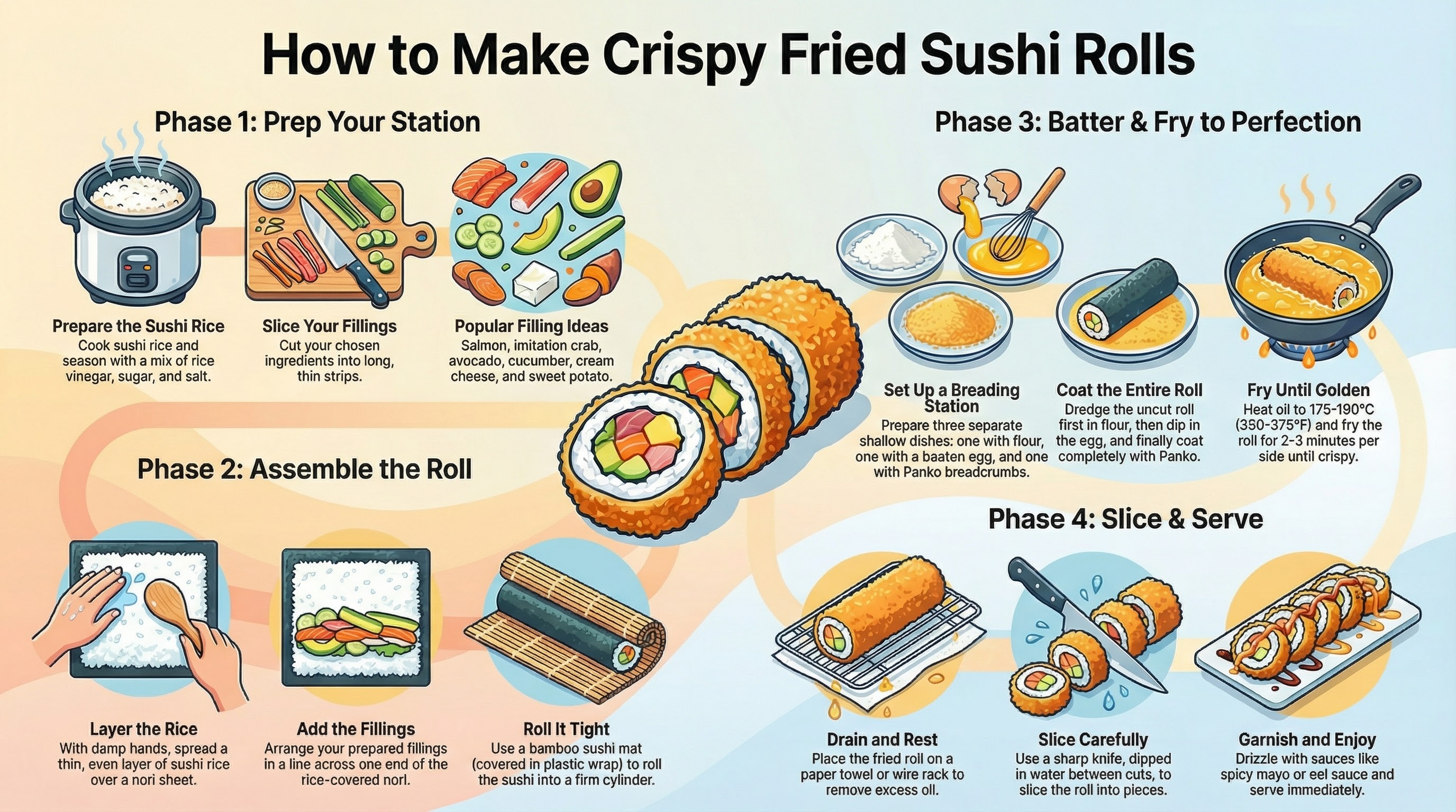 Let's be realistic - leftover fried sushi is never as good as fresh. But if you have extra, here's how to handle it.